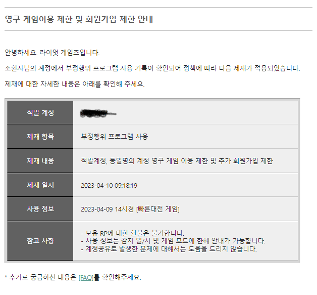 어느날 갑자기 롤 로그인이 안 되는 것을 확인합니다.. 자세히 보니 영구정지 경고창이 뜨더라구요!